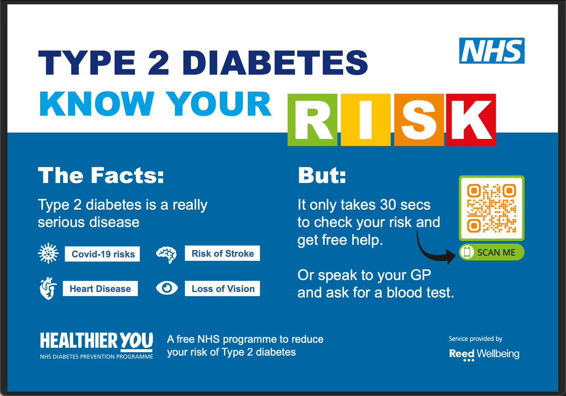 Type 2 diabetes is preventable and there are things that you can do to prevent it. May 22nd to May 28th is Diabetes prevention week and the NHS is running the Healthier You programme to try and reduce the risk of type 2 Diabetes. You can check your risk by scanning the QR code below, visiting the website reedwellbeing.org.uk/healtieryou or by calling 0800 092 1191. Find out more about the Healthier You programme by clicking on this link.